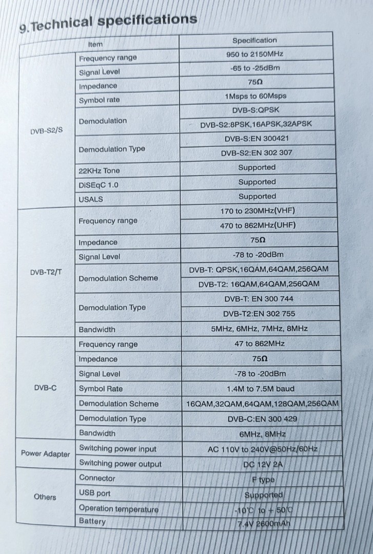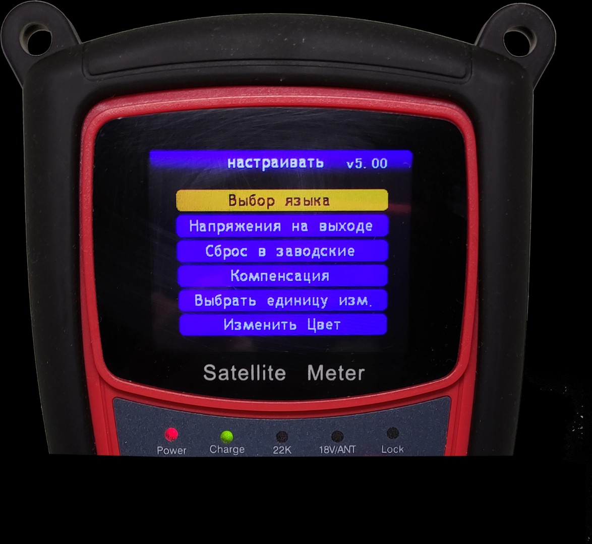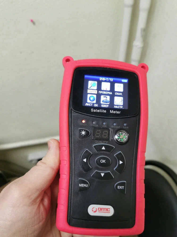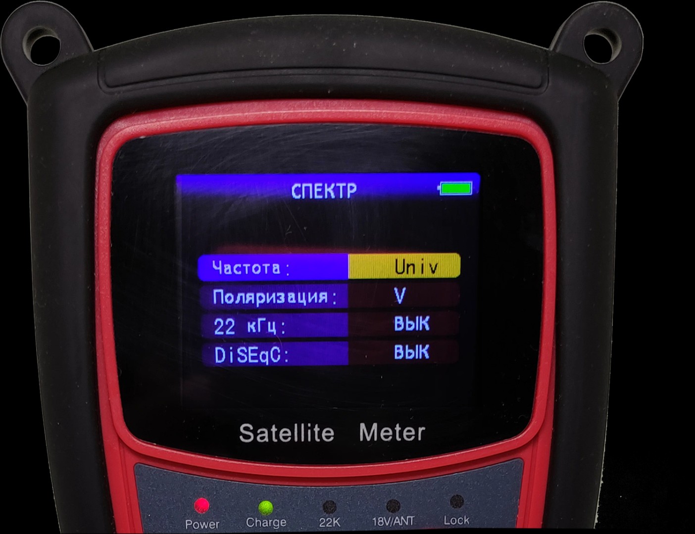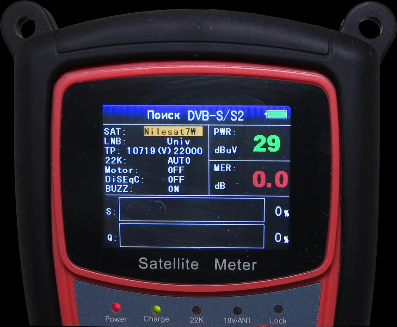 Устройство имеет дисплей диагональю 2,6 дюйма для отображения анализатора спектра. Меню достаточно простое, имеется перевод на русский язык. Подходит для настройки спутникового, эфирного и кабельного телевидения. На передней панели располагаются 8 кнопок для управления. Пять светодиодных лампочек отображают режимы работы, и имеется дополнительный экранчик для вывода значения качества сигнала. Частоты Sat на выходе от 950 до 2150, эфир 470-862 мегагерц. С его помощью можно настроить Триколор ТВ. НТВ плюс, МТС, Телекарта и любые спутники. Подача питания на конвертер возможна 13/18 вольт.