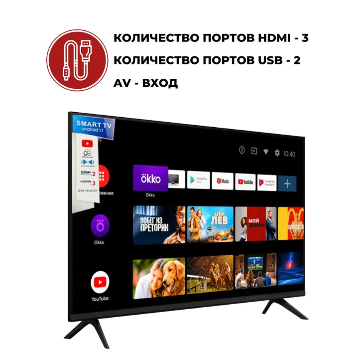 Современный и понятный интерфейс позволит взрослому и ребенку быстро настроить телевизор смарт тв и скачать приложения. Мощные динамики системы sound bar дают чистое и глубокое звучание. Телевизоры Smart TV на ОС Android 11.0 откроют вам новые возможности взаимодействия с телевизором - Google Assistance, YouTube, GooglePlay, Кинопоиск HD, НТВ ПЛЮС ТВ и многое другое. Встроенные сервисы дают безграничный доступ к новым фильмам, играм, тренировкам и бесплатным ТВ каналам (DVB T2).
