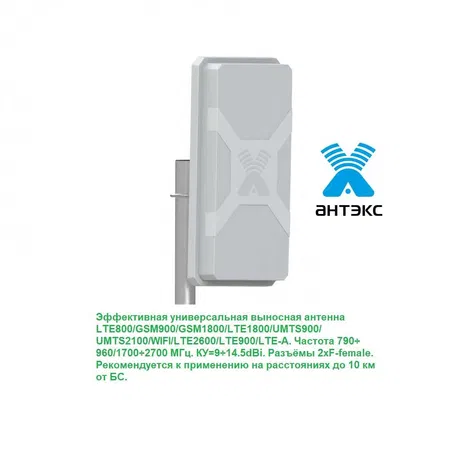 LTE800/GSM900/GSM1800/LTE1800/UMTS900/ UMTS2100/WIFI/LTE2600. Частота 790÷960/1700÷2700 МГц. КУ=9÷14.5dBi.