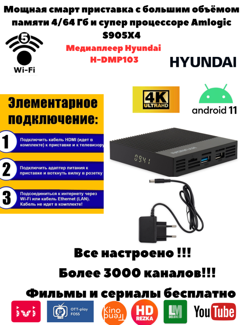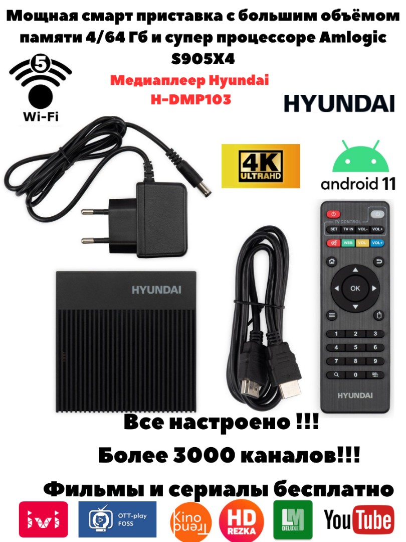 Смарт ТВ приставка Hyundai H-DMP103 – это идеальный выбор для тех, кто хочет превратить свой телевизор в многофункциональный центр развлечений без сложных настроек. Мощный процессор, большой объем памяти, поддержка 4K и удобство подключения делают её незаменимым помощником в мире современных технологий. Наслаждайтесь любимыми фильмами, играми и ТВ-каналами в лучшем качестве прямо из коробки!