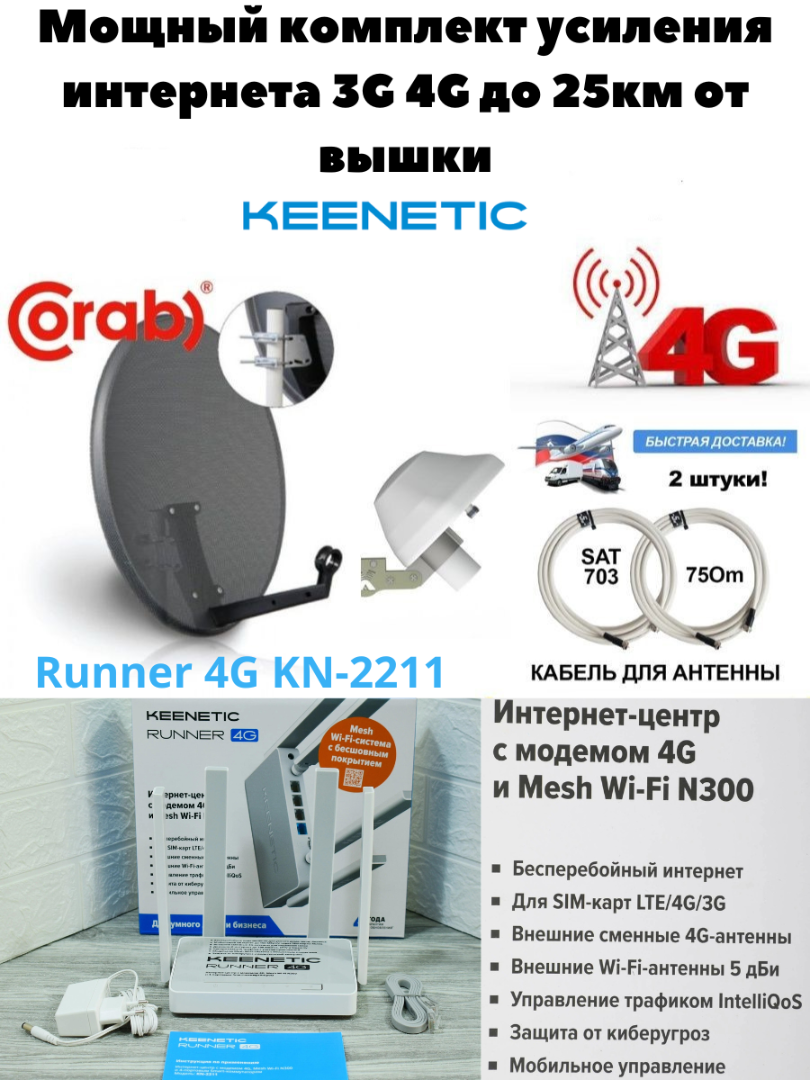 Интернет будет и у ВАС. Беспроводной маршрутизатор Keenetic Runner 4G KN-2211 (802.11n (Wi-Fi 4), 2.4 ГГц, до 300 Mbps, 802.1X, 1xWAN, 3xFast LAN) и параболической антенны - спутниковой тарелки Corab-60PR c офсетным облучателем Antex UMO-3F MIMO. Качественные кабельные сборки из медного кабеля SAT-703 помогут избежать потерь сигнала от антенны до вашего домашнего роутера.Так как роутер 4G+ с сим картой - это исключает любые потери на согласовании внутренних элементов и выгодно отличает от USB-модемов, таких как например Huawei e3372. Наши замеры на сотнях объектах это подтверждают . С помощью этого мощного комплекта вы сможете быстро решить проблему с нестабильным, прерывающимся или медленным соединением на даче или за городом. Как правило, решения на основе параболических антенн применяются в условиях очень слабого входного сигнала. Они позволяют установить надежное соединение даже в тех случаях, когда антенны других типов оказываются бессильны. Все оборудование в купленном вами комплекте уже настроено. Вам необходимо сделать несколько простых действий и наслаждаться быстрым интернетом, просмотром любимых фильмов или играми в режиме on-line. При установке антенны вам потребуется направить её на базовую станцию сотового оператора и закрепить на мачте или кронштейне. После чего подключить антенный провод роутеру (в роутер необходимо вставить СИМ-карту) и наслаждаться стабильным доступом в интернет по Wi-Fi.