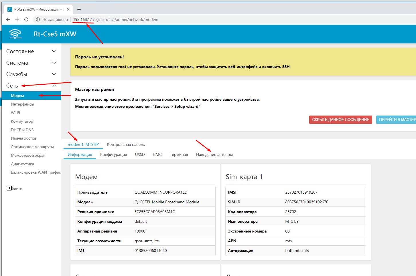 Для удобного наведения антенны можно перейти во вкладку Сеть-Модем-Наведение антенны.