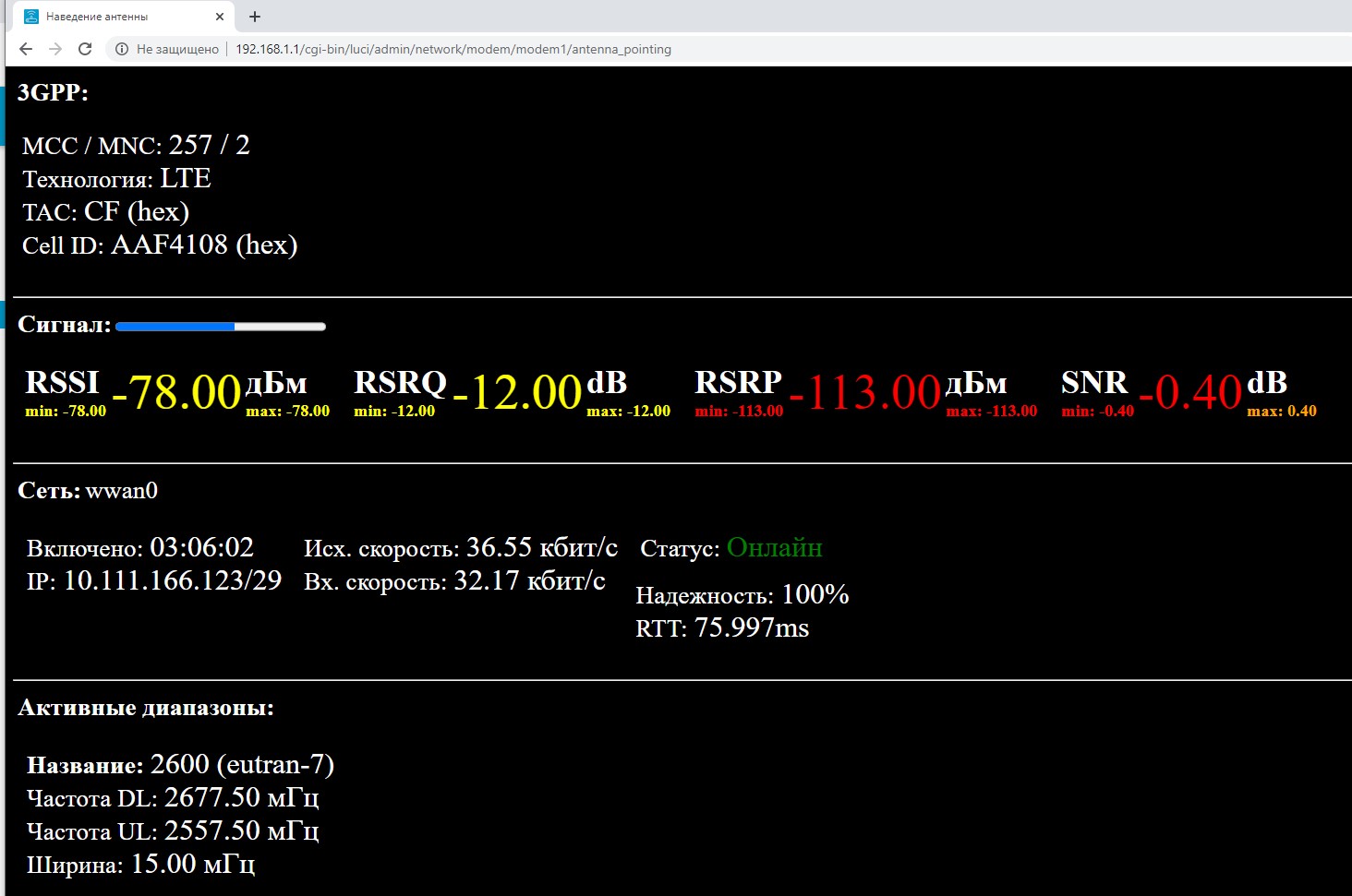 Если интерфейс модема позволяет, можно выполнить точную настройку по лучшим значениям RSSI и Ec/lo (SINR), как и в предыдущем пункте, а скорость замерять только в направлении лучшего сигнала.