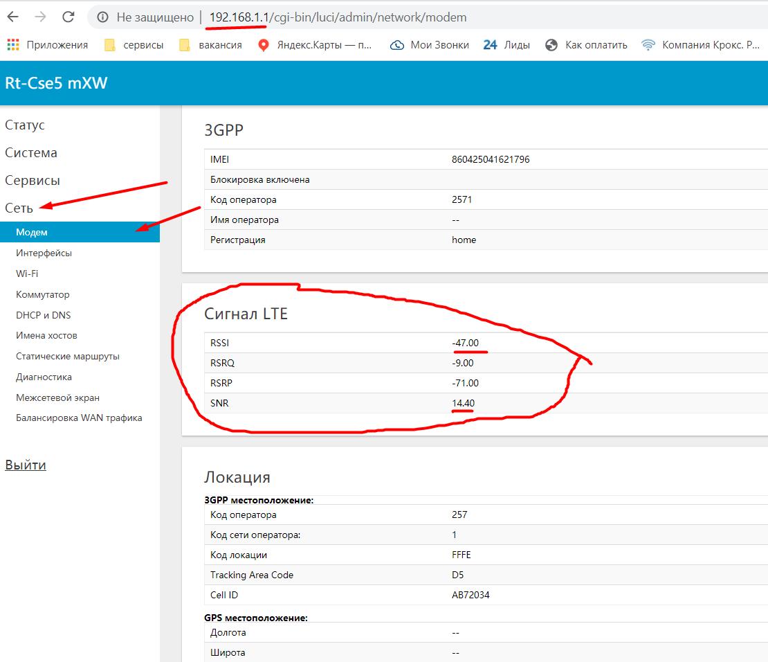 Войдите в меню «Сеть» и выберите вкладку «Модем». Откройте вкладку «Информация» и промотайте ниже до раздела с сигналом. В нашем примере модем соединен с сетью стандарта LTE (4G).