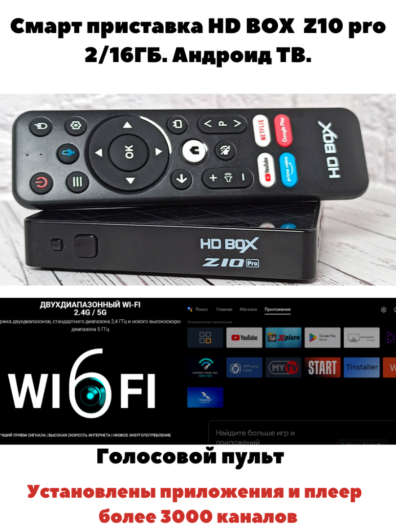 IPTV UHD-приставка HD BOX Z10Pro – является медиа приставкой для просмотра мультимедиа как с локальных накопителей памяти, так и по сети интернет, развлечений в играх и получение информации из сети интернет, а наличие штатного пульта ДУ с функцией голосового поиска, значительно повысит комфорт управления.