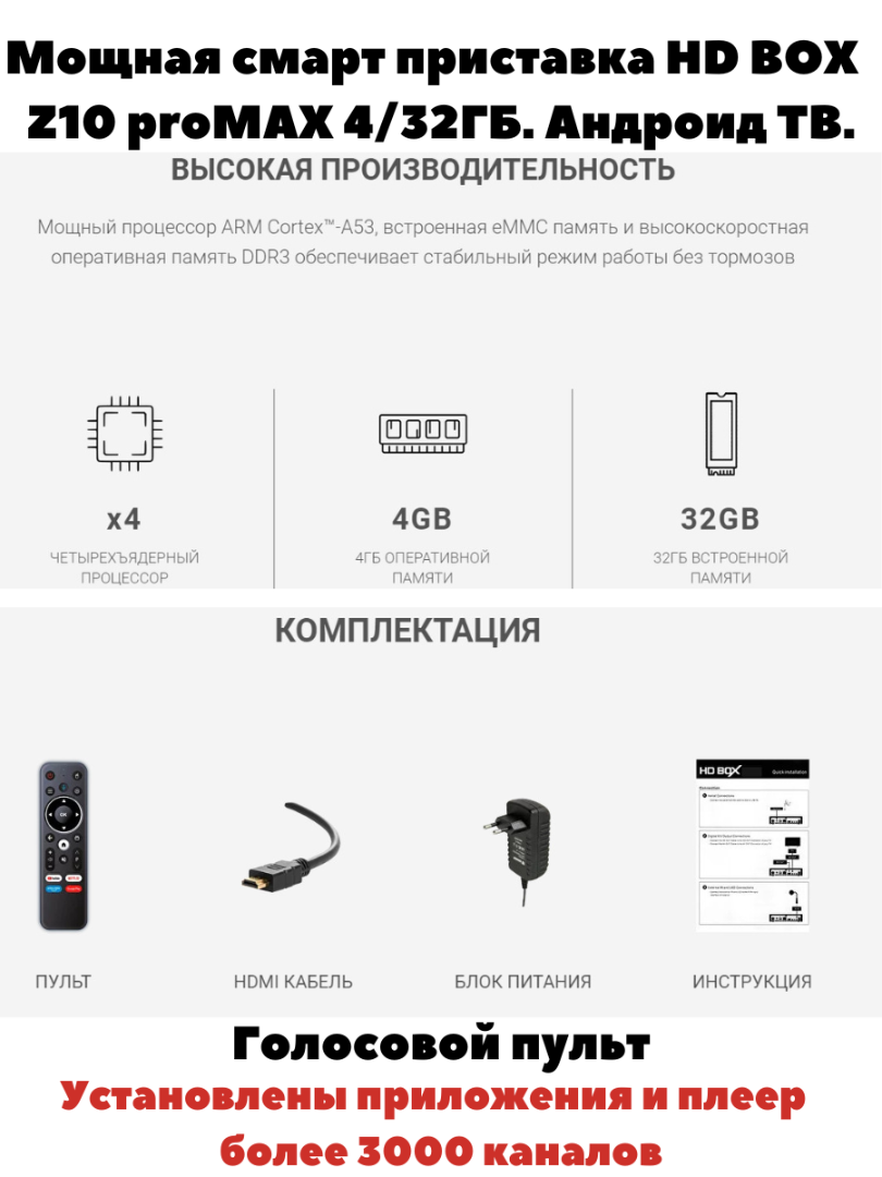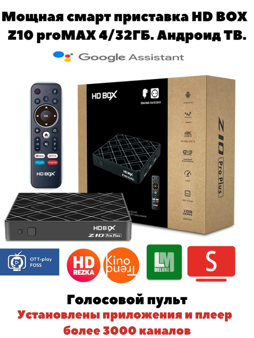 Новинка! Мощная Настроенная приставка превратит ваш телевизор в современный мультимедиа центр. Голосовой пульт в комплекте!!!Двухдиапазонный WiFi 6 модуль 2.4ГГц и 5ГГц, Встроенный модуль Bluetooth 5.0, IPTV UHD-приставка HD BOX Z10Pro MAX – является медиа приставкой для просмотра мультимедиа как с локальных накопителей памяти, так и по сети интернет, развлечений в играх и получение информации из сети интернет, а наличие штатного пульта ДУ с функцией голосового поиска, значительно повысит комфорт управления.телеприставка на 4-х ядерном высокоскоростном процессоре Allwinner H616 с 64-битной архитектурой ARM CortexTM-A53, устройство наделено 4Гб оперативной памяти DDR3 от южнокорейской компании Samsung Electronics Company и 32Гб встроенной памяти от компании Montage Technology