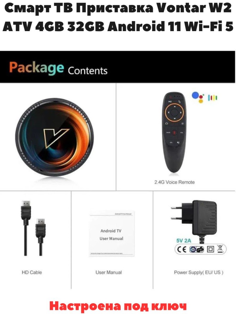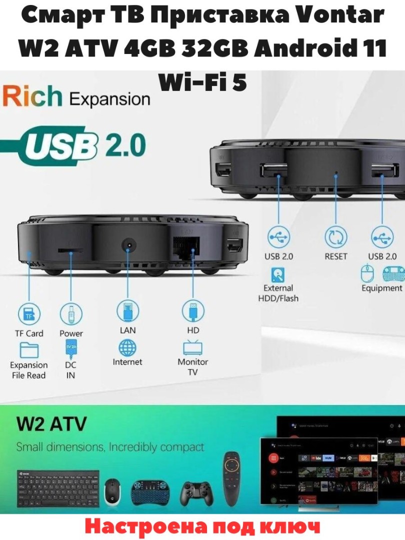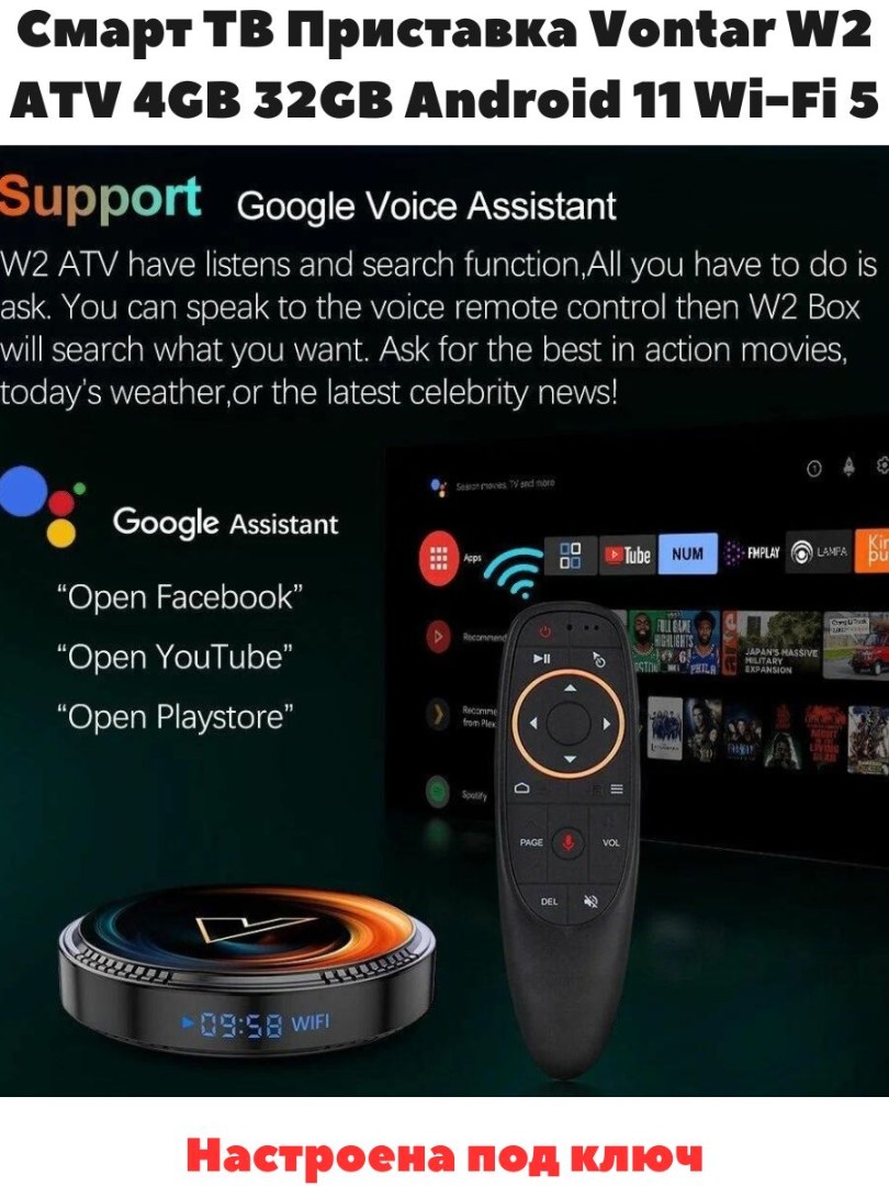 С Vontar W2 вы получите доступ к тысячам фильмов, сериалов и шоу в лучшем качестве. Поддержка 4K обеспечивает четкое и яркое изображение. Слушайте свою любимую музыку, подключившись к различным стриминговым сервисам или используя встроенную память для хранения треков. Подключение и интерфейс: Смарт-приставка Vontar W2 оснащена современными портами и интерфейсами для подключения к различным устройствам и сетям. Wi-Fi, Bluetooth, USB — все, что нужно для комфортного использования. Интуитивно понятный интерфейс позволит даже неопытному пользователю быстро освоиться с устройством. Смарт-приставка Vontar W2 — это идеальное решение для тех, кто хочет получить максимум удовольствия от просмотра контента на своем телевизоре. Элегантный дизайн, высокая производительность и доступная цена делают ее отличным выбором для каждого дома. Не упустите шанс привнести новые развлечения в свою жизнь! Установлен OTT-play FOSS и плейлист с более 3000 каналов три месяца бесплатного просмотра!!! Также установлены бесплатные кинотеатры с тысячами фильмов и сериалов.ТОП-10 Лучших приложений для Android TV:KinoTrend, NUM, Smart YouTube TV,TorrServer,HDRezka и мн.др. Только подключи к интернету. Медиаплеер представляет собой более быстро работающую смарт ТВ-приставку с мощным четырехъядерным процессором Amlogic S905W2 ARM Cortex A35. ТВ-приставка работает под управлением операционной системы Android 11.0, что позволяет устанавливать другие бесплатные приложения без каких-либо ограничений. Приставка оснащена 4 ГБ оперативной памяти и 32 ГБ внутренней памяти для более быстрой работы и увеличения объема хранилища. Смарт ТВ бокс оснащен мощным видеодекодером для более плавного и четкого воспроизведения видео.