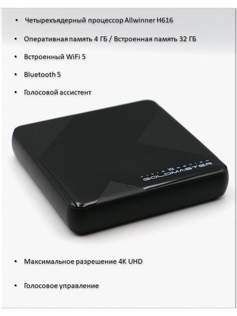 Смарт-приставка GoldMaster i-925 построена на операционной системе Android TV 10, оснащенное четырехъядерным процессором Allwinner H616 с архитектурой ARM Cortex-A53 и графическим процессором ARM G31 MP2. Изделие содержит 4 ГБ оперативной памяти DDR3 и 32 ГБ встроенной памяти eMMC, а также имеет встроенный двухдиапазонный WiFi 6 (2.4, 5 Ггц) для беспроводного подключения к интернету. В приставке также присутствуют Bluetooth 5.2, порты USB, слот для карт Micro SD, оптический выход SPDIF, HDMI-выход версии 2.0 с поддержкой разрешения 4K при 60 Гц, а также AV-выход с разъемом Jack 3.5 мм для подключения к старым телевизорам посредством 3RCA (тюльпаны).
